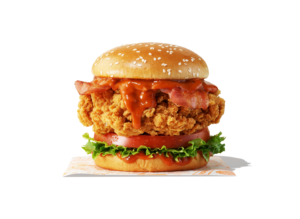 폭신한 브리오슈 번에 육즙이 팡팡 터지는 닭 다리 살 치킨 패티, 프레시한 토마토와 양상추, 달콤한 스위트 어니언 소스의 조화