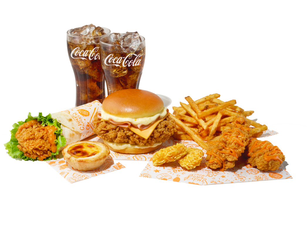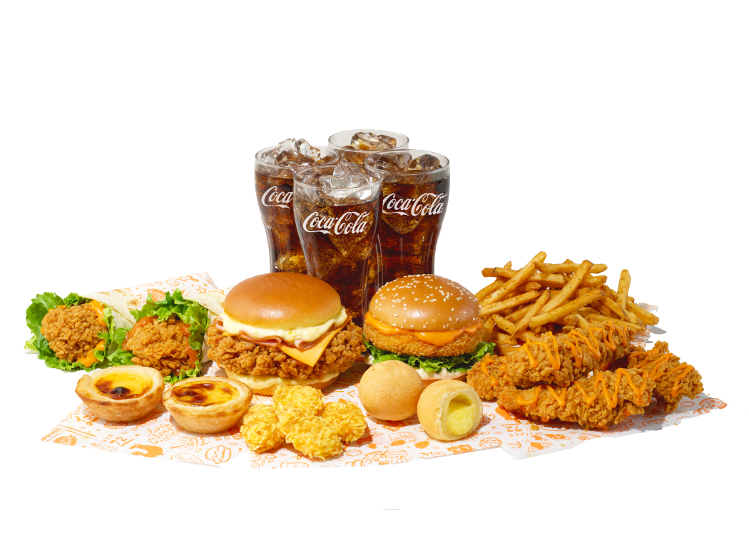 옥수수 멜팅 버거 + 츄츄 오징어버거 + 스모크 머스타드 순살치킨 4조각 + 스모크 머스타드 치킨 랩 2개 + 딥크런치 에그타르트 2개 + 슈크림 쫀득 치즈볼 2구 + 크런치크랩 4조각 + 케이준 후라이(L) + 코카콜라(M) 4개